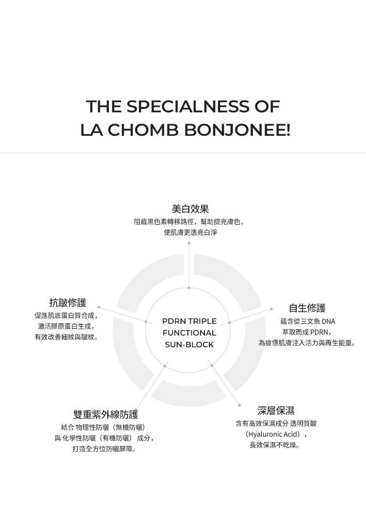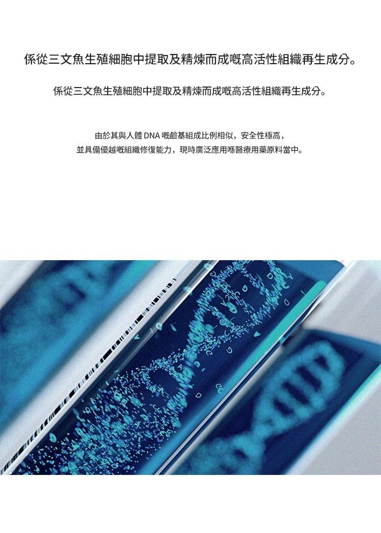 - 鮭魚DNA萃取成分PDRN,透過增加細胞生長因子活性,提供肌膚活力